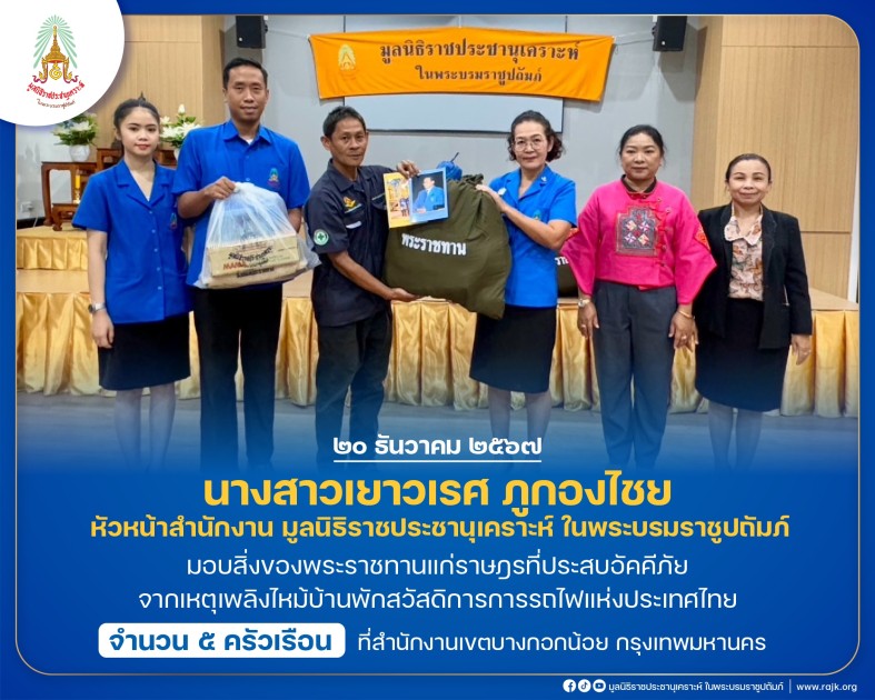 นางสาวเยาวเรศ ภูกองไชย หัวหน้าสำนักงาน มูลนิธิราชประชานุเคราะห์ ในพระบรมราชูปถัมภ์ มอบสิ่งของพระราชทานแก่ราษฎรที่ประสบอัคคีภัย จากเหตุเพลิงไหม้บ้านพักสวัสดิการการรถไฟแห่งประเทศไทย จำนวน ๕ ครัวเรือน ที่สำนักงานเขตบางกอกน้อย กรุงเทพมหานคร เพื่อเป็นขวัญและกำลังใจในการดำรงชีวิตต่อไป