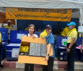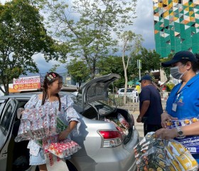 ร่วมสนับสนุนน้ำเก๊กฮวย กระเจี๊ยบ ๕๐ ขวด หมี่ผัด ๑๐ กก. และกากหมู ๒๐ ถุง