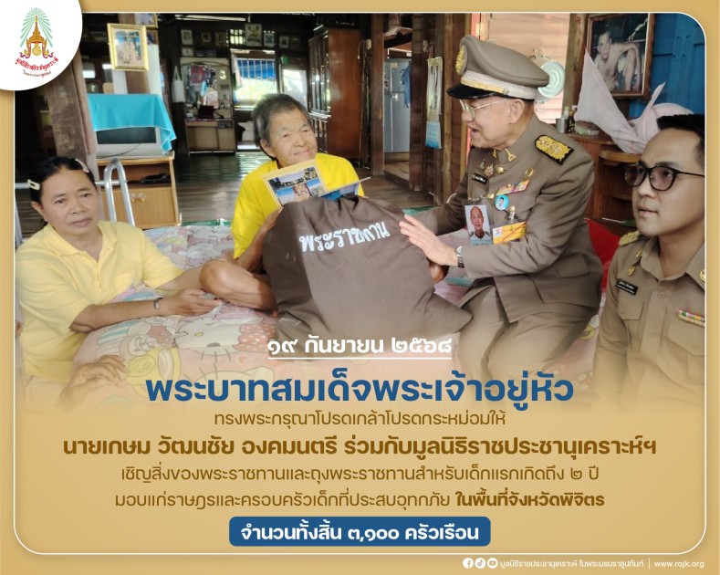 พระบาทสมเด็จพระเจ้าอยู่หัว ทรงพระกรุณาโปรดเกล้าโปรดกระหม่อมให้ นายเกษม วัฒนชัย องคมนตรี ร่วมกับมูลนิธิราชประชานุเคราะห์ ในพระบรมราชูปถัมภ์ เชิญสิ่งของพระราชทานและถุงพระราชทานสำหรับเด็กแรกเกิดถึง ๒ ปี มอบแก่ราษฎรและครอบครัวเด็กที่ประสบอุทกภัย ในพื้นที่จังหวัดพิจิตร