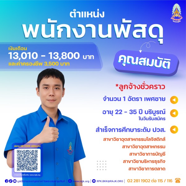🎉🎉ประกาศรับสมัครงาน🎉🎉มูลนิธิราชประชานุเคราะห์ ในพระบรมราชูปถัมภ์ 🎉รับสมัครงานบุคคลทั่วไป จำนวน 4 อัตรา📍ตำแหน่ง เจ้าหน้าที่บริหารงานทั่วไป จำนวน 1 อัตรา (เจ้าหน้าที่มูลนิธิ)📍ตำแหน่ง พนักงานพัสดุ จำนวน 1 อัตรา (ลูกจ้างชั่วคราว)📍ตำแหน่ง พนักงานขับรถยนต์ จำนวน 2 อัตรา (ลูกจ้างชั่วคราว)💙กดสมัครและรายละเอียดคลิกที่นี่ : https://forms.gle/7M79nNJs4Ahp1PDF7🔗Link ประกาศ : https://drive.google.com/file/d/1GIHpdFE1gzCeAr72sX5tWDEBaE_4nhtY/view?usp=sharing⚠️ปิดรับใบสมัครในวันศุกร์ ที่ 12 ธันวาคม 2568 📞สอบถามข้อมูลเพิ่มเติม : โทร. 02 281 1902 ต่อ 115 / 116 🗓️วันเวลาทำงาน : จ.-ศ. เวลา 08.30 - 16.30 น. ❗️มีเข้าเวรวันหยุด และลงพื้นที่ต่างจังหวัด🏢สถานที่ปฏิบัติงาน :สำนักงานมูลนิธิราชประชานุเคราะห์ฯ ถนน