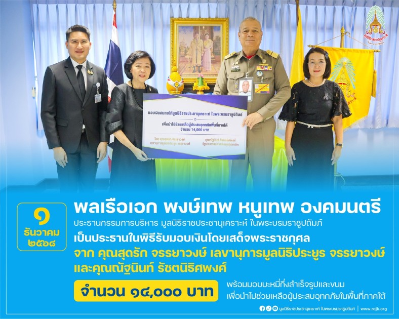 พลเรือเอก พงษ์เทพ หนูเทพ องคมนตรี ประธานกรรมการบริหาร มูลนิธิราชประชานุเคราะห์ ในพระบรมราชูปถัมภ์ เป็นประธานในพิธีรับมอบเงินโดยเสด็จพระราชกุศล จาก คุณสุดรัก จรรยาวงษ์ เลขานุการมูลนิธิประยูร จรรยาวงษ์ และคุณณัฐนินท์ รัชตนิธิศพงศ์ จำนวน ๑๔,๐๐๐ บาท พร้อมมอบบะหมี่กึ่งสำเร็จรูปและขนม เพื่อนำไปช่วยเหลือผู้ประสบอุทกภัยในพื้นที่ภาคใต้
