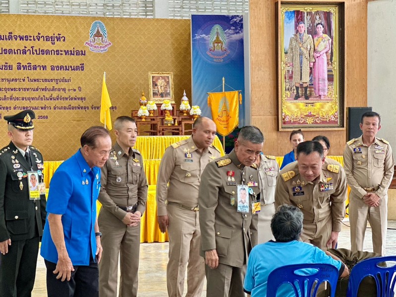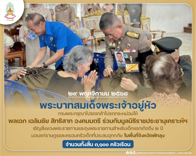 พระบาทสมเด็จพระเจ้าอยู่หัว ทรงพระกรุณาโปรดเกล้าโปรดกระหม่อมให้ พลเอก เฉลิมชัย สิทธิสาท องคมนตรี ร่วมกับมูลนิธิราชประชานุเคราะห์ ในพระบรมราชูปถัมภ์ เชิญสิ่งของพระราชทานและถุงพระราชทานสำหรับเด็กแรกเกิดถึง ๒ ปี มอบแก่ราษฎรและครอบครัวเด็กที่ประสบอุทกภัย ในพื้นที่จังหวัดพัทลุง