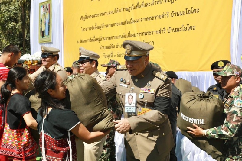 จากนั้นองคมนตรีและคณะเดินทางไปยังโครงการหมู่บ้านยามชายแดนอันเนื่องมาจากพระราชดำริ บ้านมะโอโคะอำเภออุ้มผาง จังหวัดตาก เพื่อเชิญสิ่งของพระราชทาน ประกอบด้วย เสื้อกันหนาวเด็ก มอบให้แก่เด็กในพื้นที่โครงการ จำนวน ๖๒ ตัว และถุงพระราชทาน มอบให้แก่ราษฎรและผู้ปฏิบัติงานในพื้นที่โครงการฯ จำนวน ๑๐๔ ชุด