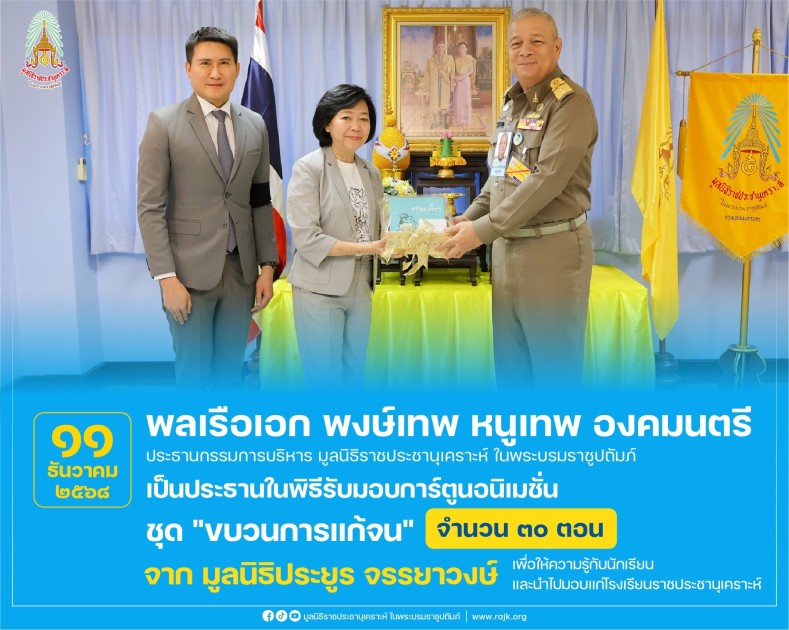 พลเรือเอก พงษ์เทพ หนูเทพ องคมนตรี ประธานกรรมการบริหาร มูลนิธิราชประชานุเคราะห์ ในพระบรมราชูปถัมภ์ เป็นประธานในพิธีรับมอบอุปกรณ์บันทึกข้อมูล (Flash Drive) บันทึกการ์ตูนอนิเมชั่น ชุด "ขบวนการแก้จน" จำนวน ๑ ชิ้น และหนังสือ "ศุขเล็ก" พิมพ์ในโอกาสชาตกาล นายประยูร จรรยาวงษ์ จำนวน ๑๐ เล่ม จาก มูลนิธิประยูร จรรยาวงษ์ โดย คุณสุดรัก จรรยาวงษ์ เลขานุการมูลนิธิประยูร จรรยาวงษ์ และคุณณัฐนินท์ รัชตนิธิศพงศ์ เพื่อให้ความรู้กับนักเรียนและนำไปมอบแก่โรงเรียนราชประชานุเคราะห์
