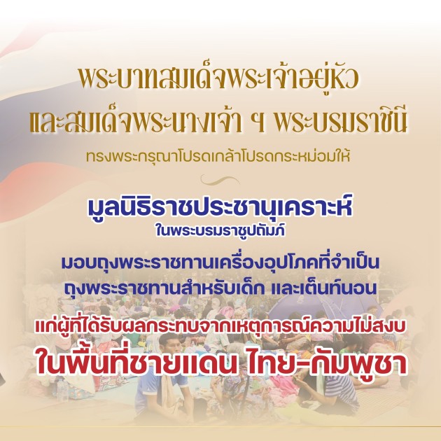 พระบาทสมเด็จพระเจ้าอยู่หัว และสมเด็จพระนางเจ้า ฯ พระบรมราชินี ทรงพระกรุณาโปรดเกล้าโปรดกระหม่อมให้ มูลนิธิราชประชานุเคราะห์ ในพระบรมราชูปถัมภ์ มอบถุงพระราชทานเครื่องอุปโภคที่จำเป็น ถุงพระราชทานสำหรับเด็ก และเต็นท์นอนแก่ผู้ที่ได้รับผลกระทบจากเหตุการณ์ความไม่สงบในพื้นที่ชายแดน ไทย-กัมพูชา