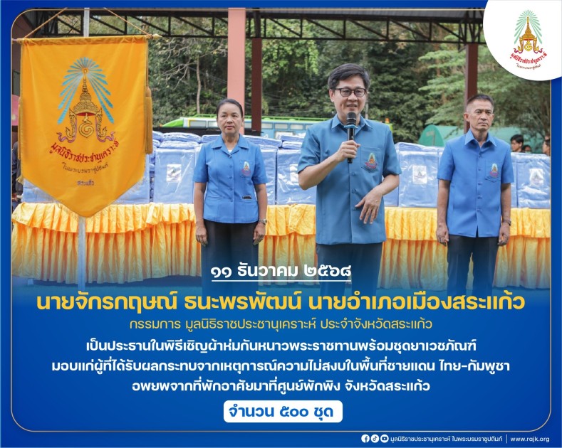 นายจักรกฤษณ์ ธนะพรพัฒน์ นายอำเภอเมืองสระแก้ว กรรมการ มูลนิธิราชประชานุเคราะห์ ประจำจังหวัดสระแก้ว เป็นประธานในพิธีเชิญผ้าห่มกันหนาวพระราชทานพร้อมชุดยาเวชภัณฑ์ มอบแก่ผู้ที่ได้รับผลกระทบจากเหตุการณ์ความไม่สงบในพื้นที่ชายแดน ไทย-กัมพูชา อพยพจากที่พักอาศัยมาที่ศูนย์พักพิง จังหวัดสระแก้ว จำนวน ๕๐๐ ชุด