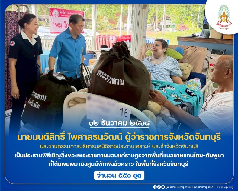 นายมนต์สิทธิ์ ไพศาลธนวัฒน์ ผู้ว่าราชการจังหวัดจันทบุรี ประธานกรรมการบริหารมูลนิธิราชประชานุเคราะห์ ประจำจังหวัดจันทบุรี เป็นประธานพิธีเชิญสิ่งของพระราชทานมอบแก่ราษฎรจากพื้นที่แนวชายแดนไทย–กัมพูชา ที่ได้อพยพมายังศูนย์พักพิงชั่วคราว ในพื้นที่จังหวัดจันทบุรี จำนวน ๕๕๐ ชุด