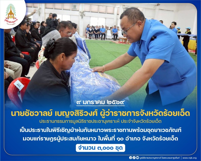 นายชัชวาลย์ เบญจสิริวงศ์ ผู้ว่าราชการจังหวัดร้อยเอ็ด ประธานกรรมการมูลนิธิราชประชานุเคราะห์ ประจำจังหวัดร้อยเอ็ด เป็นประธานในพิธีเชิญผ้าห่มกันหนาวพระราชทานพร้อมชุดยาเวชภัณฑ์ มอบแก่ราษฎรผู้ประสบภัยหนาว ในพื้นที่ ๑๐ อำเภอ จังหวัดร้อยเอ็ด จำนวน ๓,๐๐๐ ชุด ณ หอประชุมที่ว่าการอำเภอพนมไพร อำเภอพนมไพร จังหวัดร้อยเอ็ด