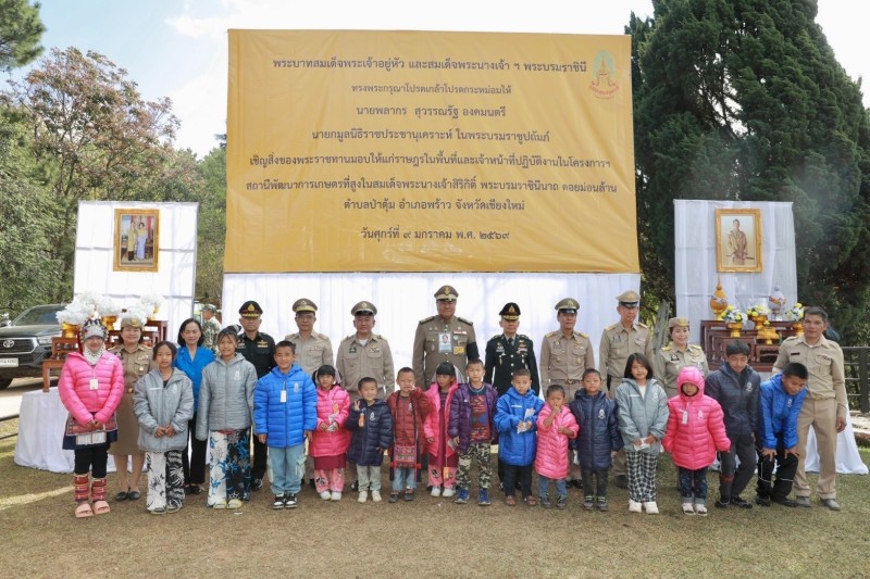 ประธานอนุกรรมการติดตามและขับเคลื่อนโครงการอันเนื่องมาจากพระราชดำริในพื้นที่ภาคเหนือ พร้อมด้วยนางสุพร ตรีนรินทร์ เลขาธิการ กปร. เจ้าหน้าที่มูลนิธิราชประชานุเคราะห์ ในพระบรมราชูปถัมภ์ ที่ปรึกษาคณะอนุกรรมการฯ และคณะอนุกรรมการฯ เดินทางไปยังโครงการสถานีพัฒนาเกษตรที่สูงในสมเด็จพระนางเจ้าสิริกิติ์ พระบรมราชินีนาถ ดอยม่อนล้าน ตำบลป่าตุ้ม อำเภอพร้าว จังหวัดเชียงใหม่ เพื่อเชิญสิ่งของพระราชทานจากพระบาทสมเด็จพระเจ้าอยู่หัว และสมเด็จพระนางเจ้าฯ พระบรมราชินี ไปมอบให้แก่ราษฎรและผู้ปฏิบัติงานในพื้นที่โครงการฯ ประกอบด้วย ถุงพระราชทาน จำนวน ๑๔๐ ถุง และเสื้อกันหนาวเด็ก จำนวน ๗๔ ตัว
