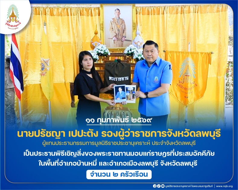 นายปรัชญา เปปะตัง รองผู้ว่าราชการจังหวัดลพบุรี ผู้แทนประธานกรรมการมูลนิธิราชประชานุเคราะห์ ประจำจังหวัดลพบุรี เป็นประธานพิธีเชิญสิ่งของพระราชทานมอบแก่ราษฎรที่ประสบอัคคีภัย ในพื้นที่อำเภอบ้านหมี่ และอำเภอเมืองลพบุรี จังหวัดลพบุรี จำนวน ๒ ครัวเรือน