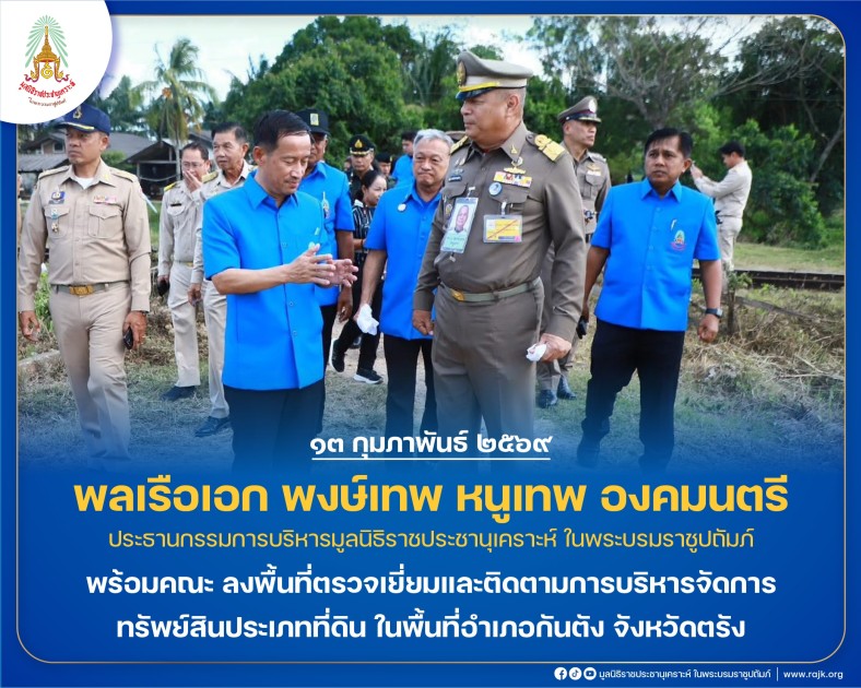 พลเรือเอก พงษ์เทพ หนูเทพ องคมนตรี ประธานกรรมการบริหารมูลนิธิราชประชานุเคราะห์ ในพระบรมราชูปถัมภ์ พร้อมคณะ ลงพื้นที่ตรวจเยี่ยมและติดตามการบริหารจัดการทรัพย์สินประเภทที่ดิน ซึ่งเป็นกรรมสิทธิ์ของมูลนิธิ ในพื้นที่อำเภอกันตัง จังหวัดตรัง เพื่อติดตามความคืบหน้าการใช้ประโยชน์ในพื้นที่ ให้เป็นไปตามวัตถุประสงค์หลักของมูลนิธิ ในการสงเคราะห์ช่วยเหลือผู้ประสบสาธารณภัย และสนับสนุนการศึกษาแก่นักเรียนที่ขาดแคลนทุนทรัพย์