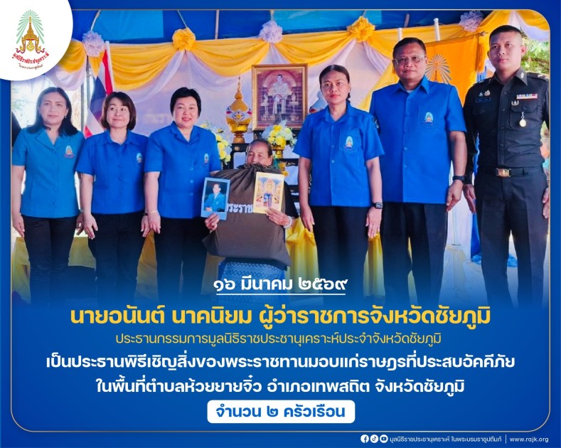 เป็นประธานพิธีเชิญสิ่งของพระราชทานมอบแก่ราษฎรที่ประสบอัคคีภัย ในพื้นที่ตำบลห้วยยายจิ๋ว อำเภอเทพสถิต จังหวัดชัยภูมิ จำนวน ๒ ครัวเรือน