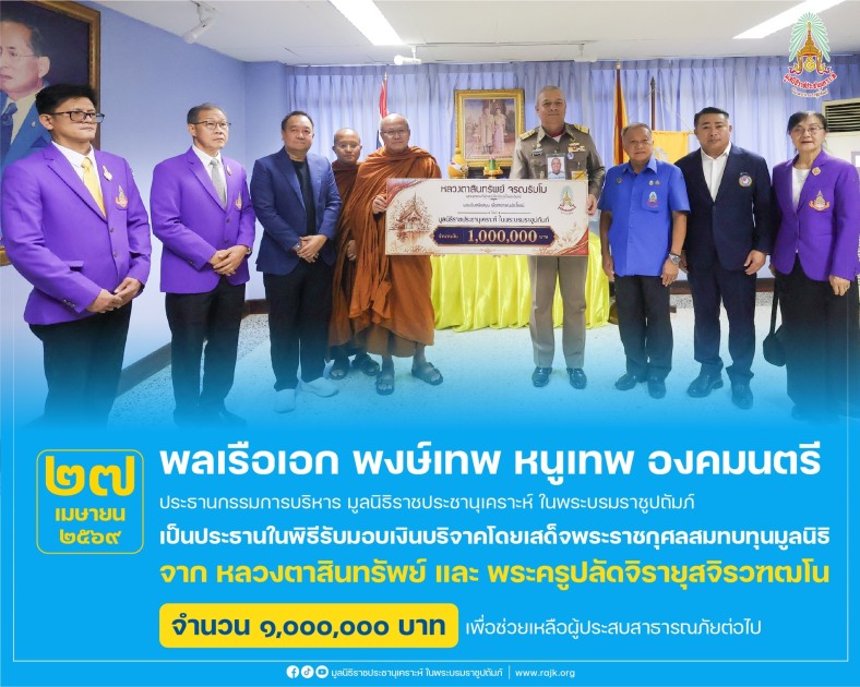 พลเรือเอก พงษ์เทพ หนูเทพ องคมนตรี ประธานกรรมการบริหาร มูลนิธิราชประชานุเคราะห์ ในพระบรมราชูปถัมภ์ เป็นประธานในพิธีรับมอบเงินบริจาคโดยเสด็จพระราชกุศลสมทบทุนมูลนิธิ จากหลวงตาสินทรัพย์ และ พระครูปลัดจิรายุสจิรวฑฒโน จำนวน ๑,๐๐๐,๐๐๐ บาท เพื่อช่วยเหลือผู้ประสบสาธารณภัยต่อไป